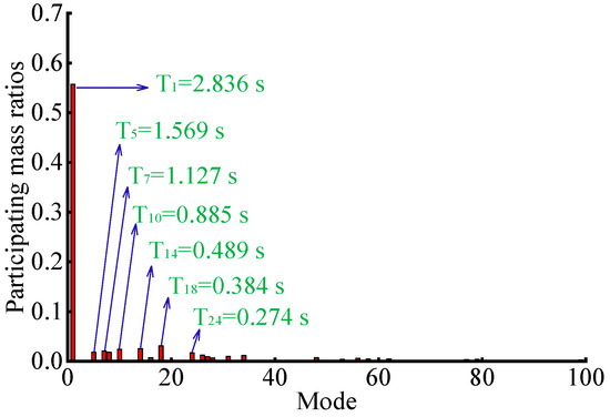 Accurately understanding the dynamic characteristics of bridges is a prerequisite for seismic analysis. This study focuses on the longitudinal seismic performance of the bridge, so the model participating mass ratios in the longitudinal direction is presented (Figure 4). The typical longitudinal vibration shapes of piers and corresponding participating mass ratios are described in Table 2. The fundamental period of the bridge is 2.836 s and the participating mass ratio is only 55.7%, indicating that the bridge is a long-period irregular structure. The cumulative participating mass ratios in the longitudinal direction for the first 30 modes are only 75%, and it takes up to the 181st mode for the cumulative factor to exceed 85%, revealing the complexity of the structural modal behavior.