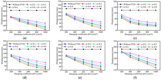 The symmetric hysteretic behavior of FVDs is mainly determined by the damping coefficient C and velocity exponent α. The damping coefficient C, relative velocity v between the piston and the cylinder, and the velocity exponent α jointly control the damping force. In this study, the damping coefficient C is varied between 200 and 1000 kN·(s/m)α, and the velocity exponent α is varied from 0.2 to 0.8, to find the optimal parameters for the FVDs in the tall-pier girder bridge. A total of 26 cases are considered for the parametric analysis. The primary function of FVDs is to enhance structural damping, providing both energy dissipation and displacement-limiting effects under strong earthquakes [20]. Thus, displacement responses are selected as the primary control indices, with internal force responses as secondary indicators. To assess the effectiveness of different FVD parameters, the seismic mitigating ratio is introduced and defined as Seismic Mitigating Ratio = (Response with FVD − Response without FVD)/Response without FVD.