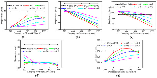 As shown in Figure 7, the longitudinal displacement responses of pier tops exhibit more complex variations for different pier heights. Under a fixed velocity exponent α, the top displacements of tall piers P2 and P3 decrease with increasing damping coefficient C. When the damping coefficient C remains constant, the top displacements of tall piers P2 and P3 increase with increasing velocity exponent α. It should be noted that the pier top displacements of P2 are all lower than the results from the models without FVDs (Figure 7b). However, pier top displacement of P3 could exceed the results when endowed with smaller damping coefficient C and larger velocity exponent α (Figure 7c). Conversely, the top displacements of tall piers P1 and P5 increase with increasing damping coefficient C, and decrease as velocity exponent α increases. Specifically, the pier top displacements exceed the results without FVDs when endowed with extreme small α and relatively large C (Figure 7e). For pier P4, the pier top displacements remain relatively stable (Figure 7d), within the range of C = 400 to 800, and all values are significantly smaller than the results without FVDs. Overall, the employment of FVDs can significantly reduce the longitudinal displacements of the bearings, girder ends, and pier tops.