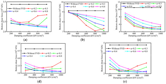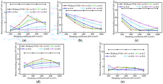 Figure 9 reveals that the installation of FVDs effectively reduces the bottom bending moment responses of all piers. For tall piers P2 and P3, the bottom bending moment also decreases with increasing damping coefficient C, and increases with increasing velocity exponent α (except α = 0.2). For tall piers P1 and P4, the bottom bending moment slightly increases since the damping coefficient C exceeds 400 (except α = 0.2 and 0.3). For pier P5, the bottom bending moment remains relatively stable (Figure 9e). For too small or too large velocity exponent α, the variations of bottom bending moment exhibit a non-monotonic trend for most tall piers, which should be taken into consideration for parameter optimization.
