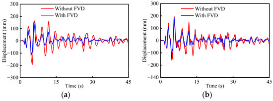 To further demonstrate the mitigation efficacy of the FVD in the tall-pier bridge, the simulations by analytical models with optimal FVDs and without FVDs are compared. Mitigating ratios of the bearing displacement and pier top displacement for all tall piers are shown in Table 3. The top displacement time histories of piers P2 and P3 with and without FVDs are compared in Figure 10. As can be observed, the maximum bearing displacements at piers P1, P3, P4, and P5 are 239.5 mm, 139.6 mm, 201.8 mm, and 230.3 mm, respectively. After the application of the optimal FVDs, these displacements are reduced to 102.1 mm, 48.9 mm, 69.6 mm, and 90.2 mm, respectively, resulting in mitigating ratios of −57.4%, −65.0%, −65.5%, and −60.8%. This quantitatively demonstrates that FVDs can significantly reduce the longitudinal bearing displacement responses for all piers, effectively preventing potential seismic damage such as girder collision or unseating. However, the mitigating ratios of the top displacement for piers P1 to P5 range from −3.0% to −26.8%, which are much lower than the displacement mitigation efficacy. In particular, the mitigating ratios of piers P3 and P5 are within −4%, which is attributed to the higher-order modes.