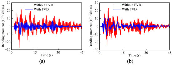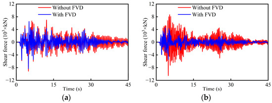 Mitigating ratios of the bottom internal force responses for all tall piers are shown in Table 4. The time histories of the bottom internal force of piers P2 and P3 with and without FVDs are compared in Figure 12 and Figure 13. The mitigating ratios of the shear force for movable piers ranges from −30.4% to −54.2% and those of the bending moment are from −17.9% to −46.4%, which demonstrates good mitigation efficacy. The discrepancy of mitigating ratios reveals that there is no linear relationship between displacement responses and internal forces like in bridges with medium-to-short piers. For fixed pier P2, the mitigating ratio of the shear force is only −8.8%, while that of bending moment is −25.3%. These phenomena can be attributed to the influence of higher-order modes. Overall, the optimal FVDs show promising seismic performance for tall-pier girder bridges due to their good capacities of energy dissipation and displacement restriction.