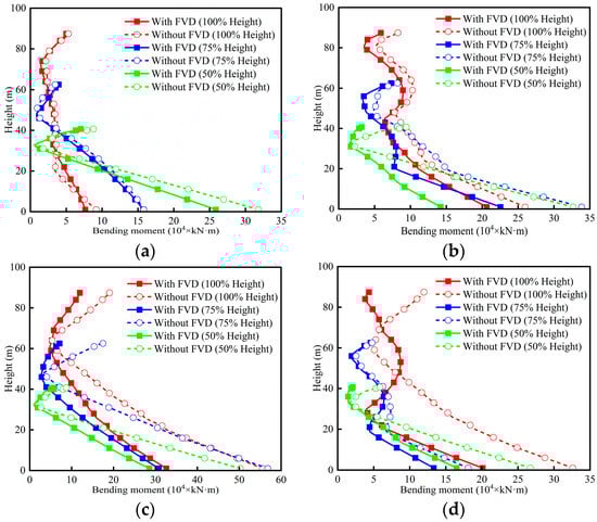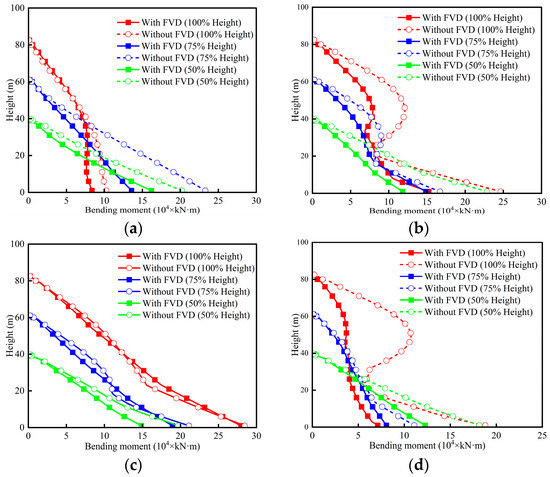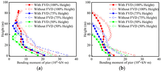 The bending moment envelopes of tall piers P2 and P3 with and without FVDs are shown in Figure 16. For the fixed pier P2, the bending moment envelope exhibits three inflection points for 100%- and 75%-heights. In addition, the bending moment in the bottom one-third region exhibits almost a linear distribution, while there is an obvious increase in the middle region due to higher-order mode effects. For 50%-height P2, however, the bending moment distribution approximately becomes linear, which agrees with the comment trend for medium-to-short piers [16]. Compared to models without FVDs, there is a significant reduction in bending moment within two-thirds of the pier height. Specially, a vertical straight-line bending moment distribution is found in the middle region of the 100%-height P2, revealing that the FVDs can improve the stress on the pier body.