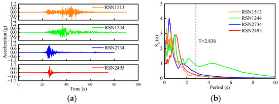 Given that tall-pier girder bridges located in mountainous regions are often near active faults and their long structure’s fundamental natural period is sensitive to long-period velocity pulse, the influence of near-field earthquakes is investigated in this section. Four near-field ground motions recorded during the Chi-Chi earthquake are selected for this study, as shown in Table 6. The acceleration time histories and response spectra of the selected near-field earthquakes are shown in Figure 17. The natural vibration period of the tall-pier girder bridge in the longitudinal direction is 2.836 s. Therefore, RSN2734 is termed a medium-period record because its pulse period (Tp = 2.436 s) is close to the longitudinal period of the tall-pier bridge. Correspondingly, RSN2495 represents a short-period record (Tp = 1.379 s) and RSN1244 a long-period record (Tp = 5.341 s). For comparison, the non-pulse record RSN1513 is also considered.