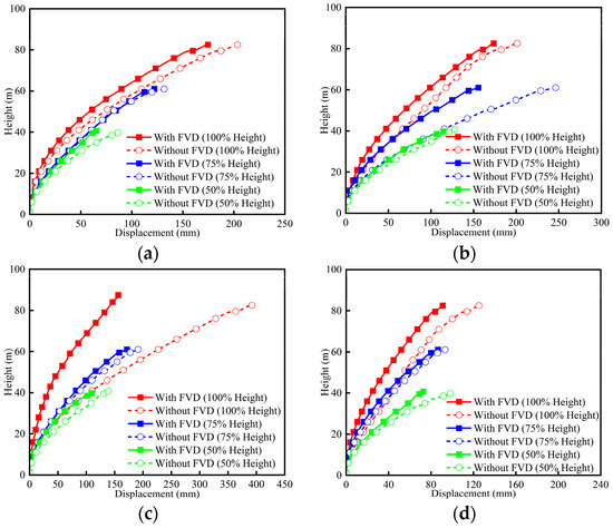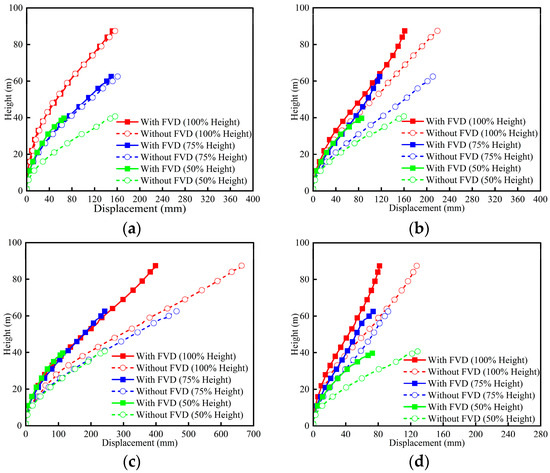 The displacement envelopes of piers P2 and P3 are shown in Figure 18 and Figure 19. As seen in Figure 18, the maximum displacements occur under long-period pulse-like motion, highlighting the slender tall-pier bridge’s sensitivity to high spectral accelerations at medium-to-long periods. Significant displacements also engender under medium-period pulse-like motion, primarily due to resonance arising from the close match between the bridge’s fundamental structural period (2.863 s) and the pulse period (2.436 s). The short-period pulse-like motion results in relatively small displacement response since its pulse period with regard to spectral amplification is far away from the fundamental structural period. The non-pulse motion produces the smallest displacement response, though its spectral values around the fundamental structural period are close to the short-period pulse-like motion (Figure 17b). As seen in Figure 19, a similar trend is observed in pier P3. Overall, the displacements of piers with different heights can be effectively reduced. For 100%-height P2 and P3, the best mitigating efficacy exhibits under long-period pulse-like motion (Figure 18c and Figure 19c). For 100%- and 75%-height P2 under short-period pulse-like motion, the displacement responses with and without FVDs are almost the same (Figure 18a). This may be attributed to the fact that the FVD is insensitive to high-frequency components together with the influence of higher-order modes.