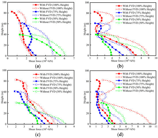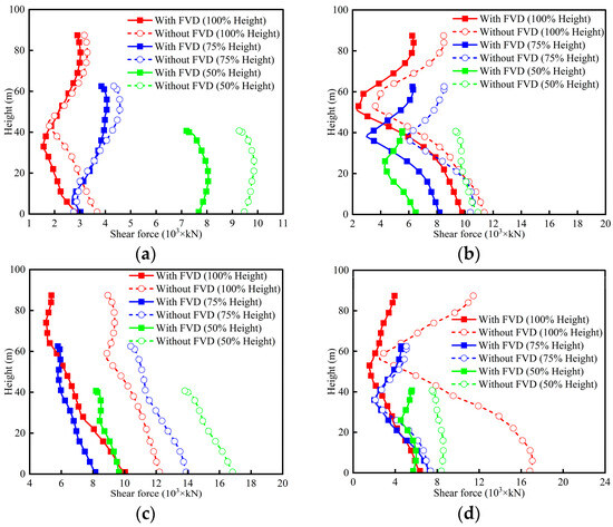 As shown in Figure 21, the shear force envelopes of the movable pier P3 exhibit more complex distributions. Under medium-period pulse-like motion and non-pulse motion, there are significantly obvious S-shaped distributions for 100%-height P3, and the smallest shear force occurs at 50 m. Under short-period pulse-like motion, weakened S-shaped shear force distributions are observed in 100%-height P3. Under long-period pulse-like motion, the shear force distributions of 100%-height P3 tend to be approximately linear. As pier heights decrease, the shear force envelopes under four types of near-field motions also approach more linear distribution, reflecting the reduced higher-order mode effects. Overall, the influence of higher-order modes on piers with three heights under different near-field earthquakes is different. By combining Figure 17b and Figure 21, it can be drawn that the higher-order modes are easily excited by the motions with large spectral values in high-frequency range. The use of FVDs not only reduces the shear force responses of tall piers, but also weakens the influence of higher-order modes.