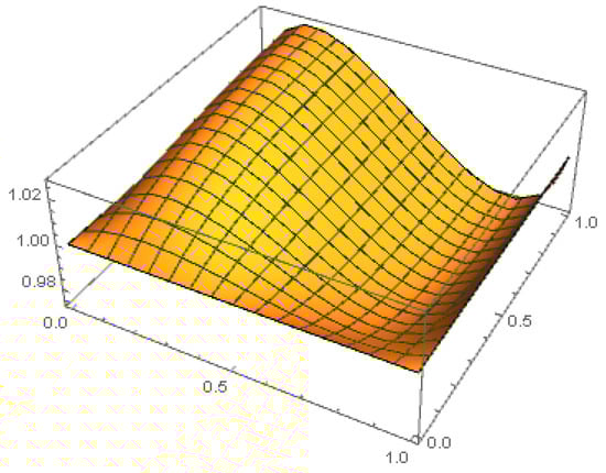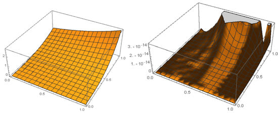First, we solve this problem with . Table 1 presents the maximum of the relative errors (REs) in various pairs of fractional orders , and the minimal of these errors is reached at . In Table 2, we compare the REs for this method with those in [43]. The comparison is based on the same number of elements in the bases of the function approximation. The table suggests that the present method provides approximate solutions with lower error. In Table 2, M is the degree of Chebyshev polynomials. Figure 1 illustrates the graphs of the approximated solution and the absolute error function (AEF) for . Here, the relative errors (REs) and absolute error function (AEF) are defined by