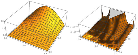 The graphs of the approximated solution (left) and the AEF (right) in Example 2 with .