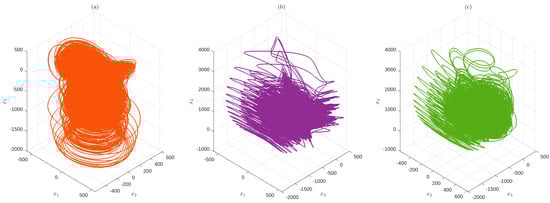 Qi hyperchaotic system’s attractors: depict 3D projections on different subspaces with same initial conditions while control parameters {} = {50,24,26,8,33,30}. (a) projection onto (--) subspace; (b) projection onto (--) subspace; and (c) projection onto (--) subspace.