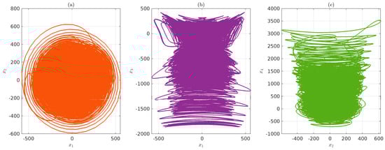 Qi Hyperchaotic system’s attractors: depict 2D projections on different planes with same initial conditions while control parameters {} = {50,24,26,8,33,30}. (a) Projection onto (-) plane; (b) projection onto (- plane; and (c) projection onto (-) plane.