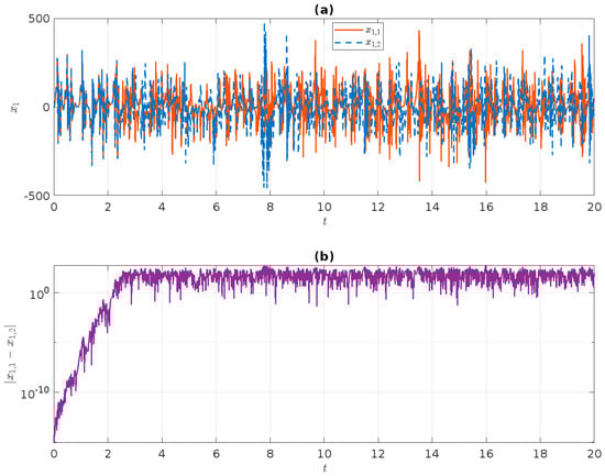 Sensitivity analysis of the Qi hyperchaotic system: (a) time evolution of two trajectories and with identical parameters but initial conditions differing by ; (b)—temporal evolution of the absolute difference demonstrating the system’s sensitive dependence on initial conditions.