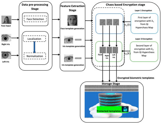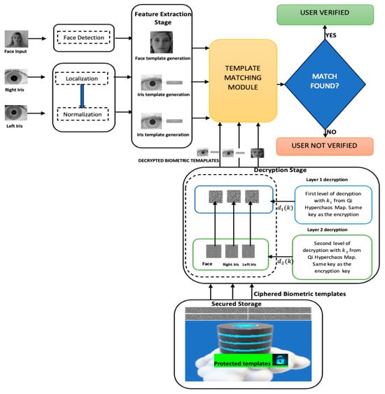 The proliferation of biometric technology across various domains including user identification, financial services, healthcare, security, law enforcement, and border control introduces convenience in user identity verification while necessitating robust protection mechanisms for sensitive biometric data. While chaos-based encryption systems offer promising solutions, many existing chaos-based encryption schemes exhibit inherent shortcomings including deterministic randomness and constrained key spaces, often failing to balance security robustness with computational efficiency. To address this, we propose a novel dual-layer cryptographic framework leveraging a four-dimensional (4D) Qi hyperchaotic system for protecting biometric templates and facilitating secure feature matching operations. The framework implements a two-tier encryption mechanism where each layer independently utilizes a Qi hyperchaotic system to generate unique encryption parameters, ensuring template-specific encryption patterns that enhance resistance against chosen-plaintext attacks. The framework performs dimensional normalization of input biometric templates, followed by image pixel shuffling to permutate pixel positions before applying dual-key encryption using the Qi hyperchaotic system and XOR diffusion operations. Templates remain encrypted in storage, with decryption occurring only during authentication processes, ensuring continuous security while enabling biometric verification. The proposed system’s framework demonstrates exceptional randomness properties, validated through comprehensive NIST Statistical Test Suite analysis, achieving statistical significance across all 15 tests with p-values consistently above 0.01 threshold. Comprehensive security analysis reveals outstanding metrics: entropy values exceeding 7.99 bits, a key space of , negligible correlation coefficients (<), and robust differential attack resistance with an NPCR of 99.60% and a UACI of 33.45%. Empirical evaluation, on standard CASIA Face and Iris databases, demonstrates practical computational efficiency, achieving average encryption times of 0.50913s per user template for 256 × 256 images. Comparative analysis against other state-of-the-art encryption schemes verifies the effectiveness and reliability of the proposed scheme and demonstrates our framework’s superior performance in both security metrics and computational efficiency. Our findings contribute to the advancement of biometric template protection methodologies, offering a balanced performance between security robustness and operational efficiency required in real-world deployment scenarios.