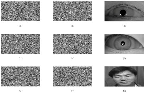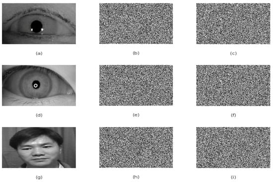 Biometric encryption stages for left iris, right iris, and face images: (a,d,g) Original plaintext images; (b,e,h) first-layer encryption results using ; (c,f,i) second-layer encryption results using .