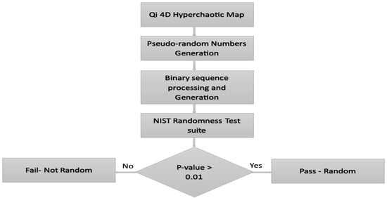 Figure 9 presents a comprehensive flow diagram depicting the NIST Statistical Test Suite implementation for evaluating the randomness properties of the 4D Qi hyperchaotic map employed in our proposed algorithm. The statistical analysis results, summarized in Table 1, demonstrate that the bit sequences generated by the Qi hyperchaotic system satisfy the NIST criteria for randomness with p-values exceeding the standard threshold of 0.01. These findings substantiate that the generated sequences possess sufficient entropy and statistical randomness properties, rendering them suitable for deployment in robust cryptographic applications.