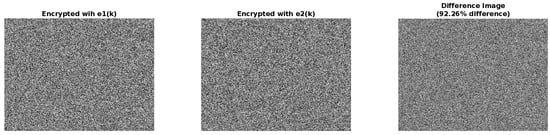 Complementing this, the UACI measures the average intensity difference between two encrypted images, targeting an ideal value of around 33.4% []. It is calculated as
