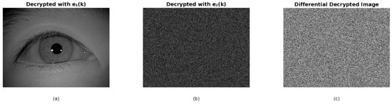 The time efficiency of encryption algorithms is crucial in modern cryptographic systems, directly impacting their practical implementation and real-world performance. In resource-constrained environments and high-throughput scenarios, the computational complexity of encryption operations significantly affects system performance and resource utilization. Therefore, optimizing the balance between security strength and computational efficiency remains a fundamental consideration in cryptographic algorithm design []. Table 6 illustrates the performance of encryption and decryption times across 512 × 512 and 256 × 256 image sizes. In comparison with existing multimodal biometric encryption schemes, our proposed approach demonstrates distinct advantages. While Zhang et al. [] implemented double chaotic rotating diffusion, our method achieves superior encryption time efficiency. Although Wang et al. [] reported marginally better computational performance, it is noteworthy that their implementation utilized 8GB RAM compared to our 4GB RAM testing environment. Furthermore, our scheme offers an expanded key space, enhancing cryptographic security. The experimental result of our approach is evidenced through extensive testing on a comprehensive image database, in contrast to the limited six-image evaluation presented by Liu et al. [], thus providing more statistically significant performance metrics. The results demonstrate that the proposed scheme offers several advantages over existing algorithms in [,,,].