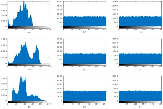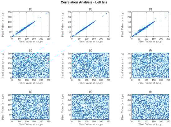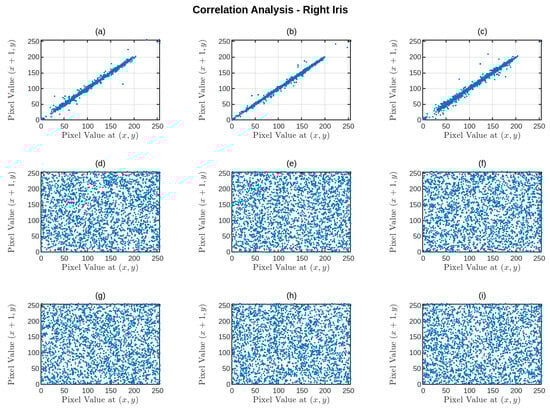 Analysis of adjacent pixel correlations across encryption layers. (a–c) Correlation distributions of the original right iris image in horizontal, vertical, and diagonal directions, respectively; (d–f) Correlation patterns following first-layer encryption in horizontal, vertical, and diagonal directions, respectively; (g–i) Correlation distributions after second-layer encryption in horizontal, vertical, and diagonal directions, respectively.