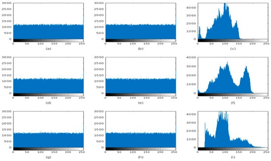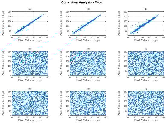 Analysis of adjacent pixel correlations across encryption layers. (a–c) Correlation distributions of the original face image in horizontal, vertical, and diagonal directions, respectively; (d–f) Correlation patterns following first-layer encryption in horizontal, vertical, and diagonal directions, respectively; (g–i) Correlation distributions after second-layer encryption in horizontal, vertical, and diagonal directions, respectively.