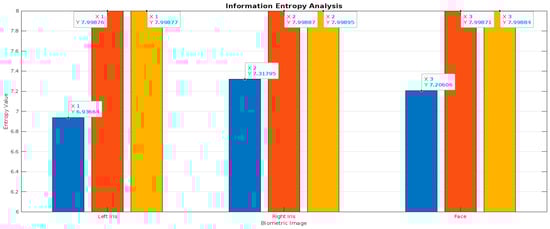 Figure 17 presents the information entropy analysis across the three stages of our proposed system showing original plaintext biometric images (blue), first-level encryption (orange), and second-level encryption (yellow) for left iris, right iris, and face images. The entropy for the first and second layers of encrypted biometrics display satisfactory values close to the idea value of 8, thus indicating that our proposed cryptosystem is robust enough and can resist brute-force attacks.