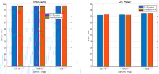 where and represent the encrypted images. Together, these metrics assess an algorithm’s diffusion properties and its ability to resist chosen plaintext attacks, with values closer to their theoretical ideals indicating stronger security characteristics in image encryption algorithms. Figure 18 illustrates the NPCR and UACI performance metrics for the first and second levels of encryption in the proposed algorithm, as applied to left iris, right iris, and facial biometric images.