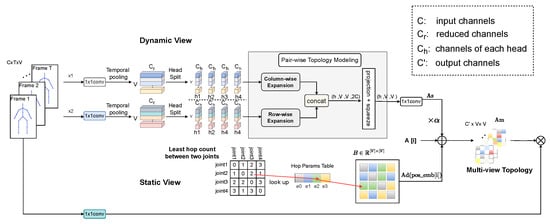 In this process, ‖ denotes the concatenation operation between each joint in and . As illustrated in Figure 2, each joint in is concatenated with each joint in . represents the fusion of channel information, ensuring thorough interaction between each joint pair in the dual-stream data. Since we employ h heads, the final derived pairwise topology is denoted as .