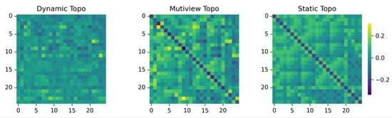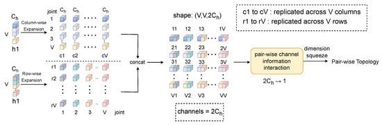 Subsequently, we expand the dimensions and concatenate the features to fuse the channel information of each pair of nodes, thereby constructing a topology matrix that fully encodes the interactions among all nodes. As illustrated in Figure 2, we use the first head as an example to demonstrate the process of pairwise topology modeling; the inputs are represented by and . As shown in Figure 2, the V node characteristics of are treated as a column and replicated V times, while the V node characteristics of are treated as a row and replicated V times: