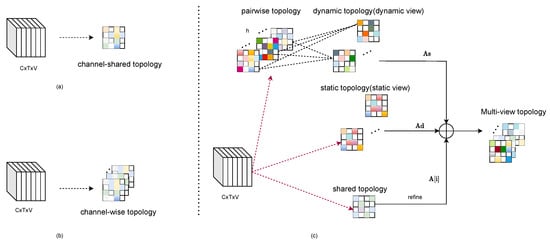 Overall illustration of Multi-view Topology: (a) the channel-shared topology used in ST-GCN, (b) the channel-wise topologies proposed by CTRGCN, and (c) the spatial modeling method adopted in our MTRGCN.