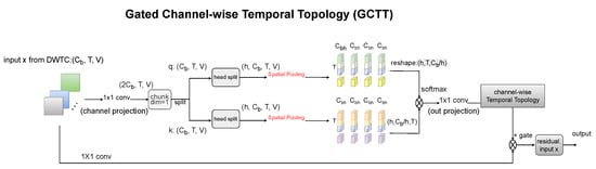 While Section 3.3.1 has achieved lightweight and efficient temporal modeling, there remains potential for further improvement in temporal feature extraction. To address this, we propose Gated Channel-wise Temporal Topology (GCTT). As depicted on the right side of Figure 5, GCTT processes the outputs from the depthwise separable convolutions of the first two branches. The detailed modeling procedure is illustrated in Figure 4. Initially, we use a 1 × 1 convolution to change the input channel size from C to 2C, and then apply a chunk operation along the channel dimension to split the input into q and k, where the input feature is denoted as , and gives the branch channels in MSTC. The dimensional changes are shown in the figure: