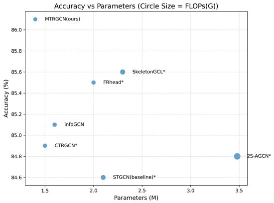 Moreover, as GCN-based methods continue to evolve and recognition accuracy improves, the ever-growing number of parameters and computational demands have emerged as major challenges. Although models such as CTRGCN [], FR-Head [], EfficientGCN-B4 [], and MST-GCN [] have achieved promising results, they still suffer from heavy model complexity and high computational costs. Therefore, this paper aims to design a high-accuracy, lightweight, and computationally efficient model.