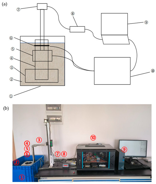 Figure 1. (a) Schematic diagram of the core resistivity imaging system, (b) photograph of the core resistivity imaging system. (① PP water tank; ② electrolyte prepared with 15% concentration of NaCl solution; ③ Φ105 mm core clamping device; ④ granite core; ⑤ peripheral electric buckling array; ⑥ circular reflux electrodes; ⑦ automatic stepping motor robotic arm; ⑧ automatic stepping motor manual operating table; ⑨ computer control terminal; ⑩ circuit control module).