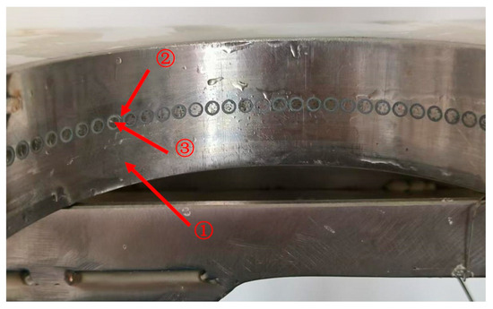 Figure 2. Details of the peripheral electrode array. ① stainless-steel shielding electrode; ② PTFE insulating ring (wall thickness 0.5 mm); ③ stainless-steel button electrode (Φ3.5 mm).