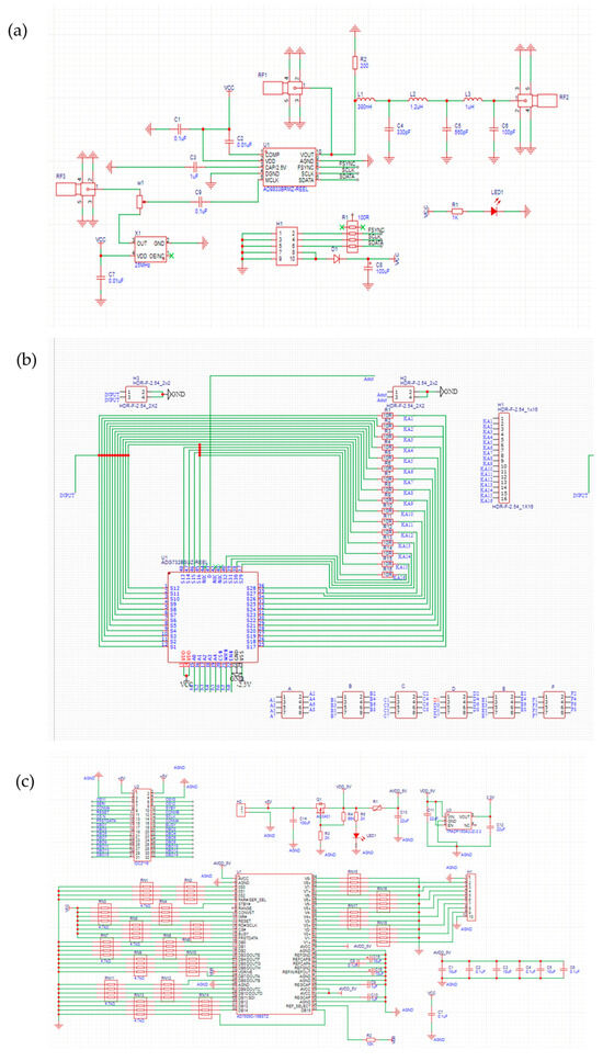 Figure 3. Block diagram of electronic circuits of (a) signal generation module, (b) switching module, and (c) data acquisition module.