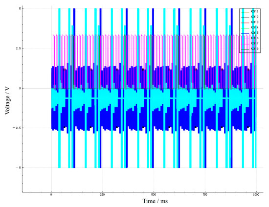 This data acquisition system employs six channels for parallel acquisition. Each channel encompasses 16 button electrodes on the full-perimeter button array. Consequently, the real-time voltage value on each button electrode can be observed in the data acquisition panel as shown in Figure 4. The voltage magnitude corresponds to the voltage magnitude of the core at the corresponding position at that instant, from which the resistance value at the corresponding position can be deduced. After data acquisition, the data is stored as a csv-format file. The file size is determined by the length of the tested core and the sampling frequency. Specifically, the longer the length of the tested core and the higher the sampling frequency, the larger the file size will be, and the longer it will take for the program to process the image.