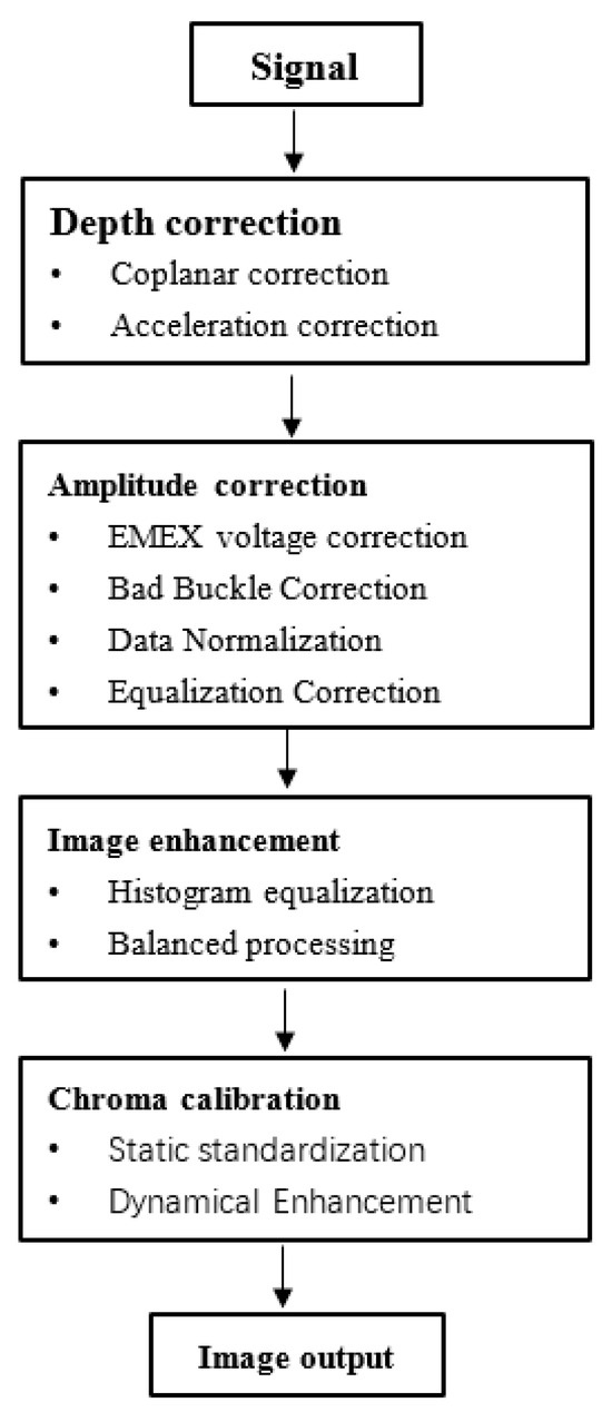 To guarantee the accuracy of subsequent processing during the imaging process, the measurement data must be appropriately pre-processed. The crucial steps in the pre-processing of core resistivity measurements comprise depth correction (including coplanar correction, acceleration correction, etc.), amplitude correction (such as EMEX voltage correction, data normalization, bad snap correction, and equalization correction, etc.), and image enhancement [20,21]. As shown in the flowchart of Figure 5, once the pre-processing is completed, the imaging of the processed data is carried out.