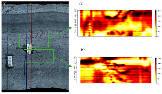 Figure 7a presents the optical picture of the core from 499.33 to 499.83 m of the second section of the Wang1 well-C lamp. This core is made of granite, with cracks and holes of varying depths and widths distributed on its surface, and the overall length of the core is 400 mm. Figure 7b,c display the imaging results obtained with the core resistivity imaging system. The actual measuring range is 60 mm, the measuring step size is 0.2 mm, the measuring duration is 6 min, and the time taken to form the image is 4 min. As a result, the surface characteristic map of the test core was obtained. The scale of the image is consistent with that of the actual measured area, and the image style is a hot style. In this image, the dark-colored part represents the low-resistivity areas on the core, reflecting the defective parts of the core, such as cracks, holes, and other geological features. In this test core, the minimum width of the cracks is 0.5 mm, and the minimum inner diameter of the holes is 0.4 mm. The shaded areas on the imaging result map are generally consistent with the defects on the test core, including details like cracks and holes.