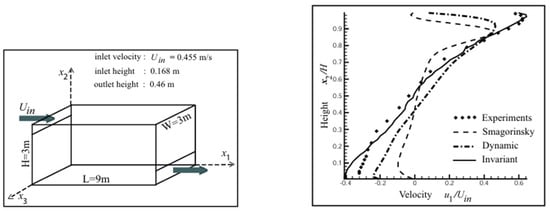 Figure 1 shows the mean velocity profiles simulated using the invariant model in a flow within a ventilated room (Nielsen’s cavity), compared with those provided by the Smagorinsky model and the dynamic model, which shows good agreement at medium values and poor agreement at extremes. At x1/L = 2/3 and x3/W = 0.5, the invariant model’s velocity profile matches experimental data more closely than the Smagorinsky and dynamic models, even without test filtering or a wall model. The result, except near the floor, shows good agreement with experimental data.