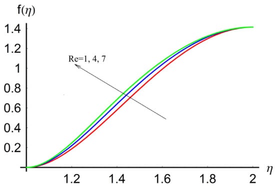 The influence of the Reynolds number (Re) on velocity profiles is illustrated in [], where an increase in Re leads to a corresponding rise in velocity (Figure 2). The accuracy of the proposed method improves with additional convergence-control parameters, enabling new explicit analytical solutions for annular axisymmetric stagnation flow and heat transfer on a moving cylinder of finite radius. The approximate solutions for the similarity function f—derived using convergence-control parameters—show strong agreement with numerical results obtained via a fourth-order Runge–Kutta method combined with a shooting approach.