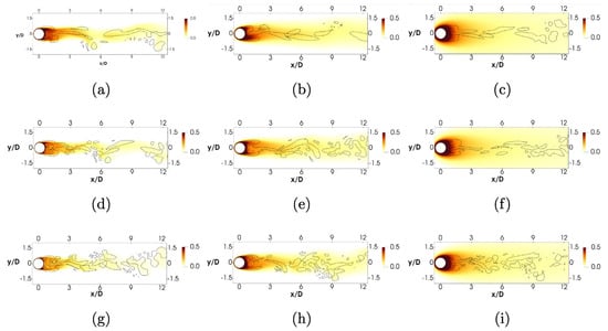 Prandtl number effect on the instantaneous fields of temperature. The temperature field superimposed with means of Q-iso-contours (black) identifies the vortical structures. (a) Re = 500, Pr = 0.7; (b) Re = 500, Pr = 0.1; (c) Re = 500, Pr = 0.01; (d) Re = 750, P r = 0.7; (e) Re = 750, Pr = 0.1; (f) Re = 750, Pr = 0.01; (g) Re = 1000, Pr = 0.7; (h) Re = 1000, Pr = 0.1; (i) Re = 1000, Pr = 0.01. Adapted from [].