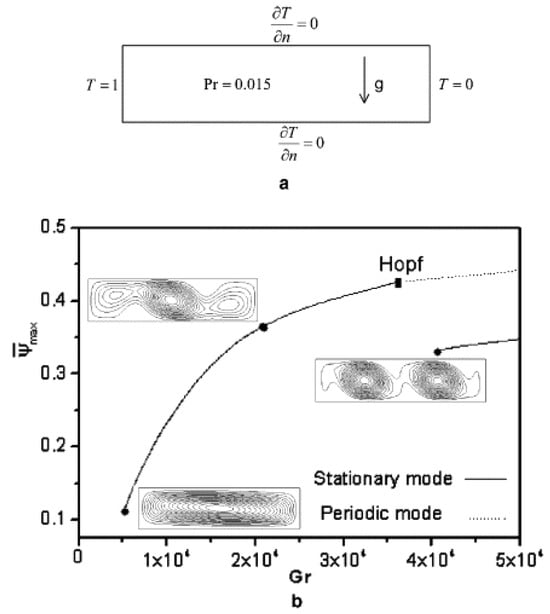 Cases: (a) configuration of the geometry, (b) diagram of bifurcation: rigid adiabatic upper and lower boundaries, 5000 < Gr < 50,000. Adapted from [].