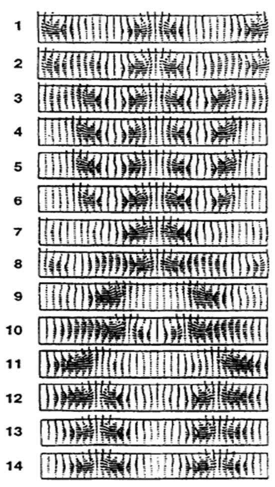 The stage was set by reviewing the relationship between hydrodynamic stability and turbulent flows [], establishing a rigorous mathematical framework that connects nonlinear energy stability criteria to global transport bounds. This foundational work highlights how stability considerations, particularly in thermal convection, can yield insights into turbulence dynamics, emphasizing the importance of laminar boundary layers in controlling transport phenomena. The reconstructed velocity field in Figure 5 clearly reveals a burst–sweep cycle, demonstrating that even this severely truncated five-mode model qualitatively reproduces key turbulent boundary layer dynamics, including vortex lateral shifting. The cycle suggests a heteroclinic orbit in phase space, where bursting is driven by excitation of unstable modes with spanwise wave numbers 1, 3, and 5. Key observations include the following: (1) a globally stable equilibrium (within the 2, 4 subspace) losing stability; (2) mixed-mode solutions emerging, with two distinct heteroclinic cycle windows; and (3) traveling wave solutions. The specific cycles occur within the second window. At lower values, complex interactions between modulated traveling waves and heteroclinic cycles are found, with solutions exhibiting chaotic characteristics. Further reduction yields simpler spanwise traveling and modulated traveling waves. Notably, as demonstrated in the bifurcation diagram, modes become unstable by the trivial equilibrium state in the sequence 2, 1, 3, 4, 5, which matches the Fourier space energy distribution.