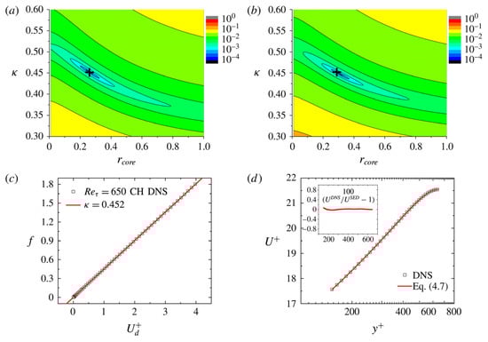 Error contours for DNS channel flow simulations using the theoretical model, with color gradients representing error magnitude. (a,b) Error distributions for Reτ = 650 and Reτ = 940, respectively, computed using the theoretical mean-velocity profile (MVP). Crosses mark optimal parameters: (κOpt ≈ 0.452, rcoreOpt ≈ 0.26) for Reτ = 650 and (κOpt ≈ 0.447, rcoreOpt ≈ 0.31) for Reτ = 940. (c) Validation at Reτ = 650 showing linear correlation between f(r,0.26) and Ud+DNS; the slope (κ = 0.452) corresponds to the von Kármán constant. (d) Theoretical MVP demonstrates excellent agreement with DNS data, with inset revealing relative errors < 0.1%. Adapted from [].