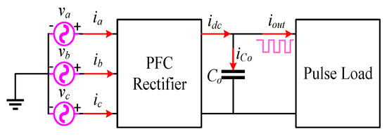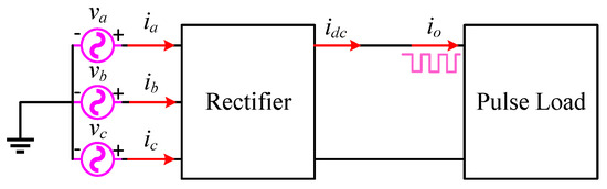 As shown in Figure 1, a three-phase voltage source is connected to a rectifier system, which outputs a DC voltage signal. The three-phase line currents , , follow the corresponding phase voltages , , to achieve power factor correction (PFC). A pulsed load is connected to the DC side of the rectifier system. According to the operating principle of the pulsed load, the pulsed load current is expressed as
