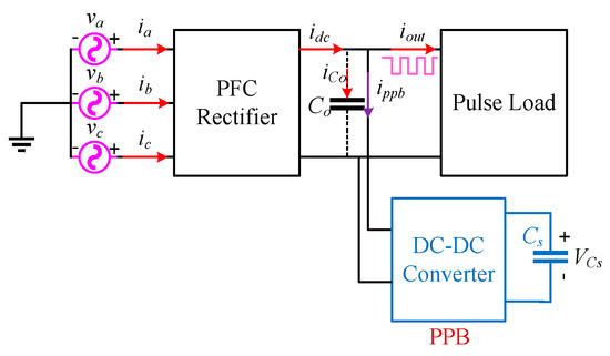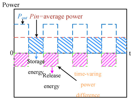 According to Equation (5), the instantaneous input power remains constant. Therefore, under pulsed load conditions, there exists an instantaneous power difference as illustrated in Figure 2. To satisfy instantaneous power balance, this power difference must be compensated by a power converter or a capacitor, as shown in Figure 3.