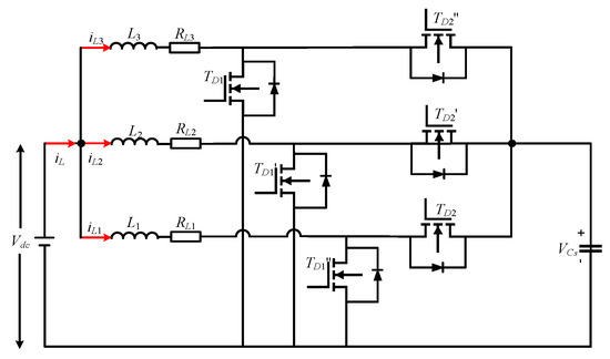 For ease of analysis, Figure 5 shows the reference current waveform of the PPB when is 50%. During segment (AB interval), the PPB absorbs the excess current from the system output; segment corresponds to the energy storage phase, during which the capacitor voltage rises. When segment (CD interval) occurs, the PPB and the system jointly supply power to the pulsed load; is the energy release phase where the capacitor voltage decreases. To reduce inductor current stress and achieve higher precision in pulsating current tracking, the PPB employs a three-phase interleaved parallel buck-boost bidirectional DC–DC converter to realize effective tracking of . The circuit topology is illustrated in Figure 6, where denotes the auxiliary energy storage inductor (hereafter referred to as the storage inductor), is the parasitic resistance, represents the MOSFET switching devices, where and , and , and are alternately turned on in pairs, and is the energy storage capacitor. Clearly, the voltage must always be higher than to ensure normal operation of the PPB. The switch conduction states and the three-phase inductor current waveforms are depicted in Figure 7. It can be observed that the drive signals for switches , , and are phase-shifted by 120° relative to each other. The input current is the sum of the three-phase inductor currents, resulting in a ripple frequency three times the switching frequency. Therefore, using a three-phase interleaved parallel buck-boost bidirectional DC–DC converter for pulsating current tracking effectively reduces current ripple and improves tracking accuracy [25].