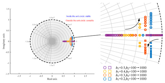 Figure 8 shows the state flow diagram of the Luenberger observer. As shown in Figure 9, four sets of closed-loop pole distributions are plotted for analysis, with taking values of 0.2, 0.3, 0.4, and 0.5, while increases from 100 to 1000 in steps of 100. When is fixed and increases, the poles initially move away from the real axis, indicating a slower dynamic response, reduced damping ratio, and increased overshoot. As continues to increase and the poles evolve into complex conjugate pairs—moving away from the real axis toward either side—the dynamic response further deteriorates. Eventually, as the poles approach the boundary of the unit circle, system oscillations become apparent.