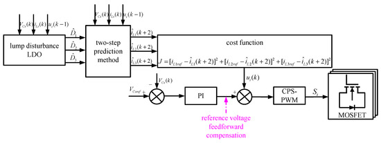 The system includes inductors, low-pass filters, and other inertial components, as well as sampling and modulation stages, all of which introduce an inherent two-step delay. When the duty cycle at time is applied to the system, the corresponding current can only be sampled by the ADC module at time . Meanwhile, the duty cycle calculated at time can only be output by the Carrier Phase-Shifted Pulse Width Modulation (CPS-PWM) modulation module at time . If this delay is not taken into account during controller design, it may lead to degraded control performance—such as increased current ripple—which in turn affects the accuracy of voltage and current prediction. Therefore, as shown in Figure 10, a two-step prediction method is adopted in this paper to compensate for the inherent delay, and the predicted results are incorporated into the cost function. The cost function is a mathematical expression that quantifies the control system’s performance, converting control objectives into optimizable numerical indicators. It guides the controller to determine the optimal switching duty cycle at each control step. The block diagram of the proposed control strategy is illustrated as follows: the discrete-time state-space equations serve as the core of the proposed control strategy. These equations are used both for predicting the future behavior of the system within the MPC framework and for updating the state estimates in the Luenberger observer. Specifically, the current system states—either measured or estimated—are propagated forward using the discrete model described in Equation (19). This equation is utilized at each sampling instant to forecast the system evolution over the prediction horizon. The predicted states are then used to optimize the control input by minimizing a defined cost function, enabling fast and accurate response to dynamic load variations. Current balancing and fast dynamic response are critical for interleaved DC–DC converters. In the proposed control framework, an observer-based predictive control strategy is adopted, in which a Luenberger observer is employed to estimate lumped disturbances in real time, including effects caused by parasitic parameters, thermal variations, and other model uncertainties. These estimated disturbances are compensated within the predictive control model to enhance the accuracy of current prediction and optimize the duty cycle accordingly. A unified control law is applied to all interleaved phases, and combined with a symmetrical hardware structure, the system naturally achieves current balancing without the need for additional current-sharing loops. This approach not only reduces hardware complexity and implementation cost, but also improves robustness against parameter variations and load disturbances, while maintaining fast dynamic response and effective ripple suppression. Furthermore, the use of a discrete-time predictive model allows the controller to anticipate future load changes and adjust the duty cycles accordingly, ensuring fast transient response. As a result, the system can maintain low current ripple, balanced inductor currents, and stable DC output even under dynamic pulsed load conditions.