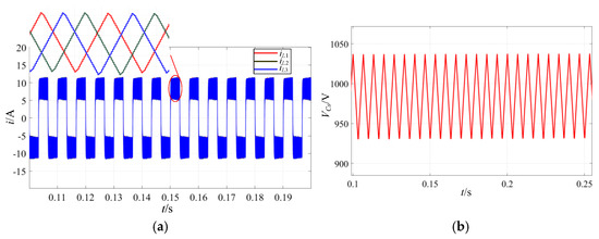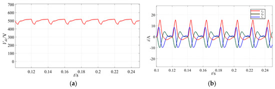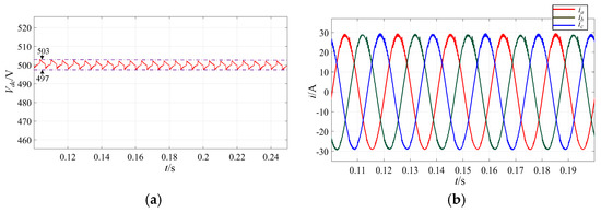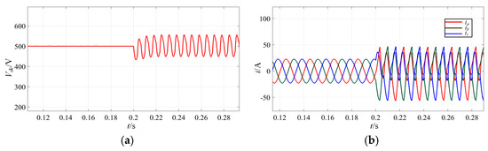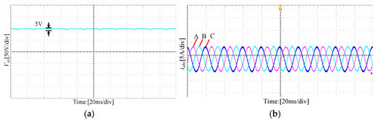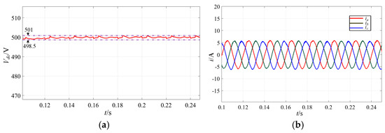 Waveform of the DC voltage and AC current after compensation: (a) DC-side voltage waveform; (b) AC-side current waveform.