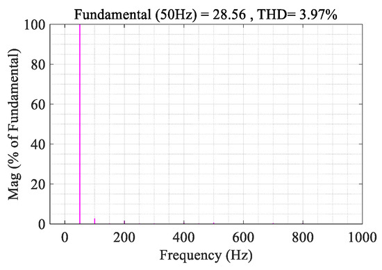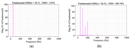 After building the system model, a conventional load was applied to observe the rectification performance under normal load conditions. As shown in Figure 11a, before 0.2 s, the DC-side voltage stabilizes near the reference voltage after passing through the rectifier circuit. At this time, the AC-side three-phase current waveform is shown in Figure 11b. The simulation results indicate that each phase current maintains a sinusoidal waveform. The FFT analysis of phase A current in Figure 12a shows a total harmonic distortion (THD) of 1.87%, which is below 5%, meeting the rectification requirements. At 0.2 s, the load was switched to the pulse load listed in Table 2. The DC-side voltage, shown in Figure 11a, fluctuates beyond the allowable range without the compensation circuit. Meanwhile, the three-phase current waveform in Figure 11b becomes distorted after 0.2 s. The FFT analysis of the current after 0.2 s in Figure 12b reveals a THD of 109.74%, far exceeding 5%, indicating that the impact caused by the pulse load is beyond the system’s tolerance.