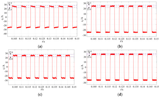 Simulated inductor current waveforms under four control strategies under condition 2: (a) PI control; (b) conventional MPC; (c) MPC with fixed-gain Luenberger observer; (d) proposed control strategy.