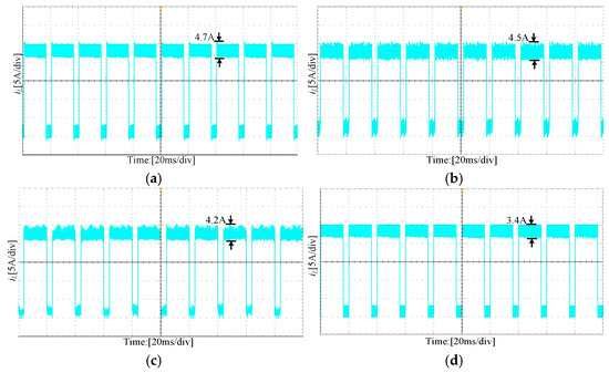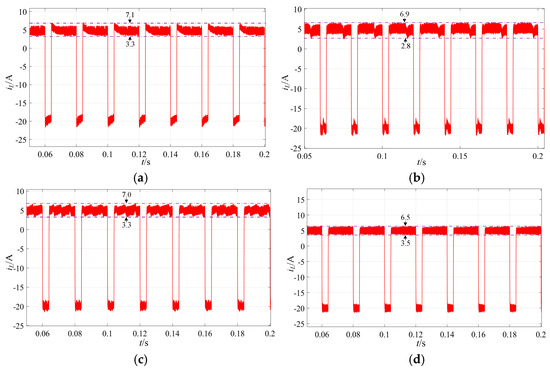 Simulated inductor current waveforms under four control strategies in condition 2: (a) PI control; (b) conventional MPC; (c) MPC with fixed-gain Luenberger observer; (d) proposed control strategy.